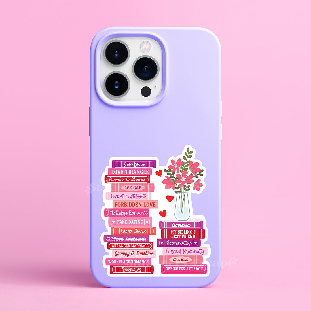 💖 Celebrate your favorite romance novel tropes with this fun Romance Tropes Book Stack Sticker! Featuring beloved romance tropes like Slow Burn, Enemies to Lovers, Fake Dating, Forced Proximity, and more, this waterproof sticker is perfect for romance readers.💕